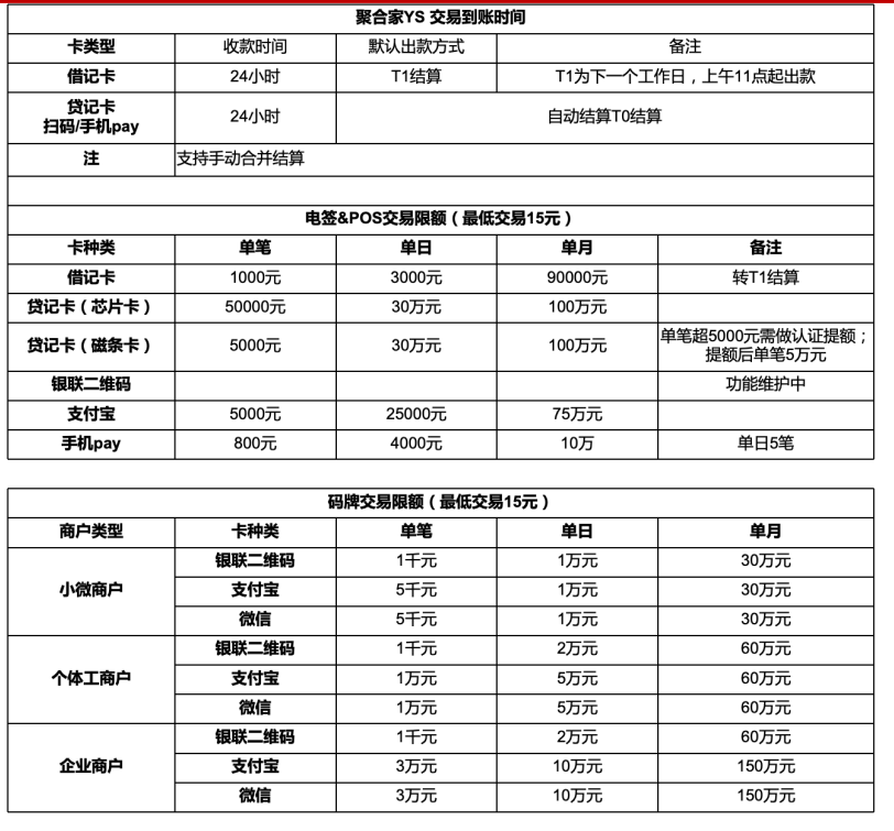 聚合家YS(聚赢家)交易到账时间表聚赢家POS机除借记卡外其他所有刷卡交易都是全天24小时秒到结算,具体刷卡到账时间及限额标准如下,