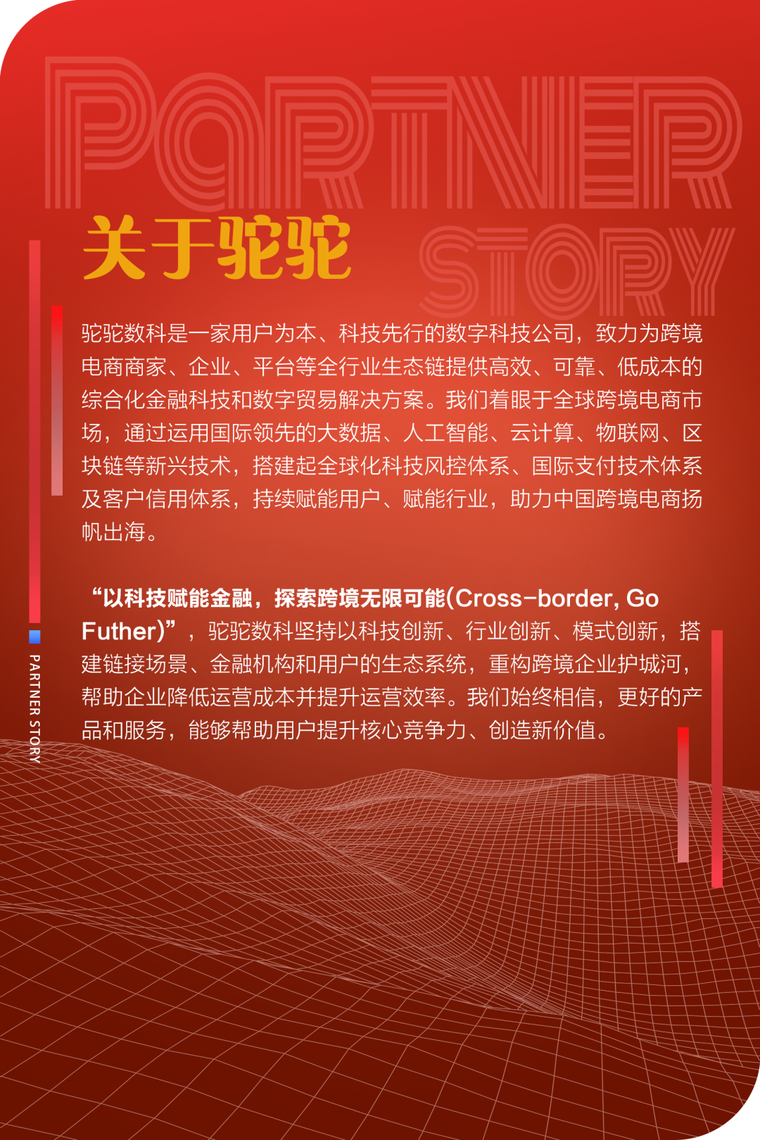 驼驼数科不仅可以为跨境商户提供包括金融、收款、付款在内的资金结算服务,还可以协助以银行为代表的金融机构,为其补足普惠金融的运营能力,提升融资获客及风险管理的能力。”